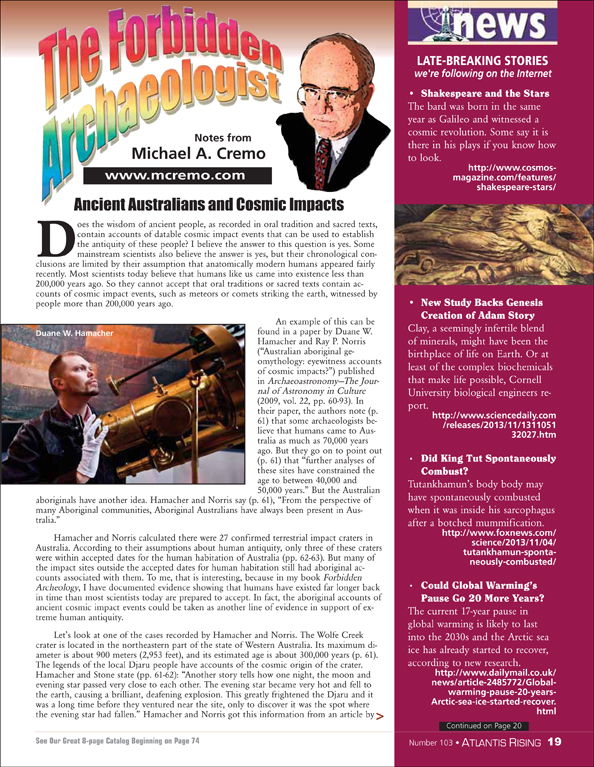 Posted on March 4, 2020April 1, 2020 by AReditorialDept Ancient Australians and Cosmic Impacts Does the wisdom of ancient people, as recorded in oral tradition and sacred texts, contain accounts of datable cosmic impact… You must be logged in to view this content. Post navigationPrevious post: Can the “New Fire” (aka Cold Fusion) Ignite the Young?Next post: Deep Time in Deep Trouble