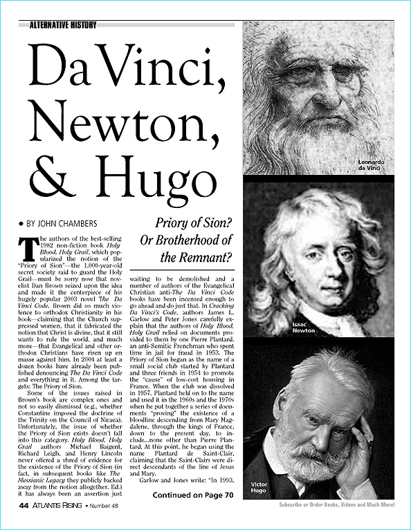 Posted on March 4, 2020October 9, 2020 by AReditorialDept Da Vinci, Newton & Hugo The authors of the best-selling 1982 non-fiction book, Holy Blood, Holy Grail, which popularized the notion of the “Priory of… You must be logged in to view this content. Post navigationPrevious post: The Further Mysteries of Rosslyn ChapelNext post: Spain’s Ancient Pathway