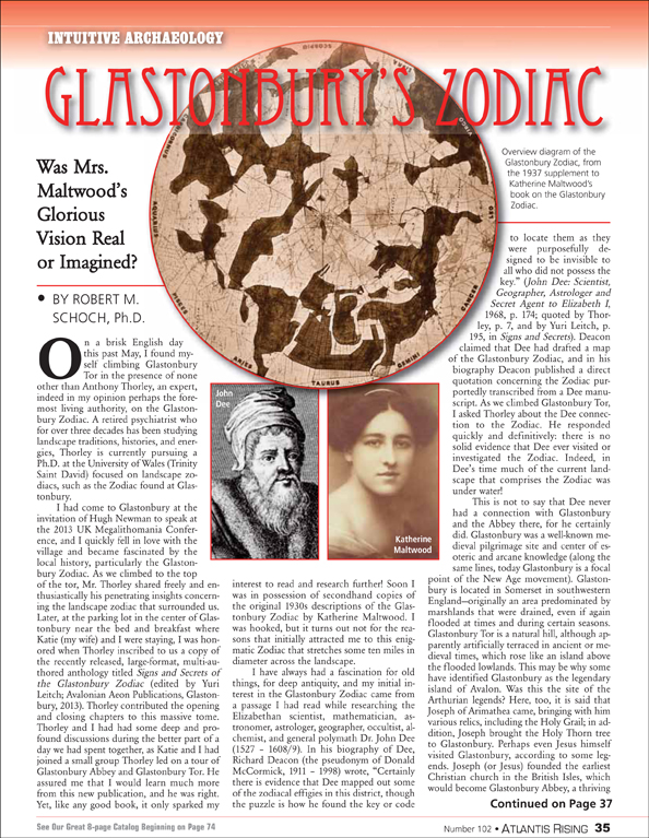 I had come to Glastonbury at the invitation of Hugh Newman to speak at the 2013 UK Megalithomania Conference, and I quickly fell in love with the village and became fascinated by the local history, particularly the Glastonbury Zodiac. As we climbed to the top of the tor, Mr. Thorley shared freely and enthusiastically his penetrating insights concerning the landscape zodiac that surrounded us. Later, at the parking lot in the center of Glastonbury near the bed and breakfast where Katie (my wife) and I were staying, I was honored when Thorley inscribed to us a copy of the recently released, large-format, multi-authored anthology titled Signs and Secrets of the Glastonbury Zodiac (edited by Yuri Leitch; Avalonian Aeon Publications, Glastonbury, 2013).