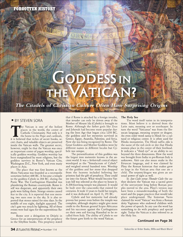 The Vatican is one of the holiest places in the world—the center of Catholic Christianity. Not only is it home to the Pope and cardinals, it is believed that riches of secret books, secret charts, and valuable objects are preserved inside the Vatican walls. The greatest secret, however, might be that the Vatican was once an important center of pagan worship, specifically goddess worship. Goddess worship has been marginalized by most religions, but the goddess survives in Rome’s Vatican City, Washington D.C., New York, and even many places in Asia.
