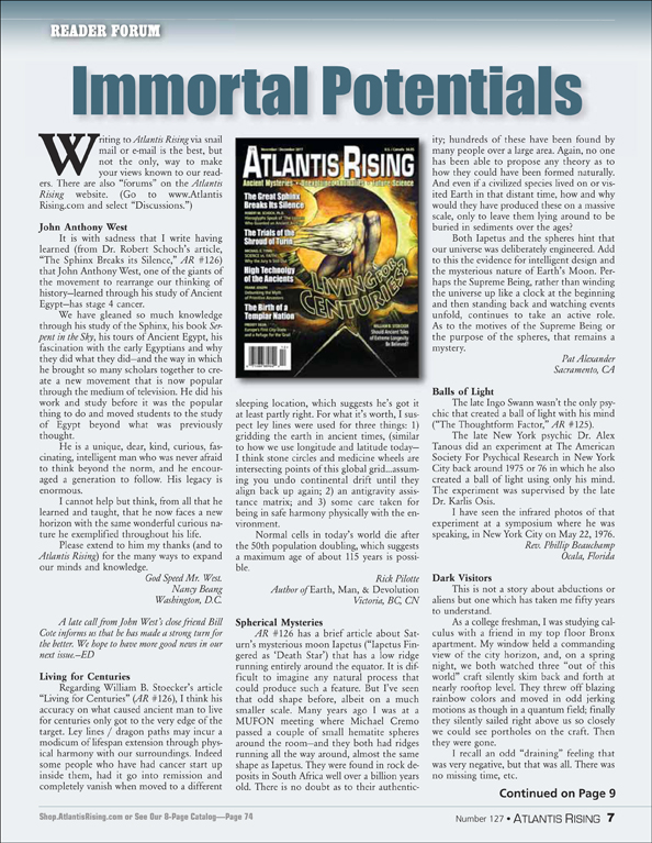 Posted on March 4, 2020October 6, 2020 by AReditorialDept Immortal Potentials Writing to Atlantis Rising via snail mail or email is the best, but not the only, way to make your… You must be logged in to view this content. Post navigationPrevious post: Reclaiming the Lost Secrets of a GoddessNext post: Battery Breakthrough Means Cars of the Future Will Be Electric