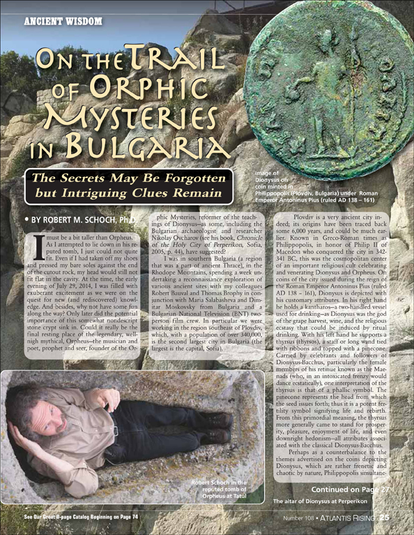 Posted on March 4, 2020October 2, 2020 by AReditorialDept On the Trail of Orphic Mysteries in Bulgaria I must be a bit taller than Orpheus. As I attempted to lie down in his reputed tomb, I just… You must be logged in to view this content. Post navigationPrevious post: Civilization from Before the Deluge?Next post: The Reality of High Strangeness