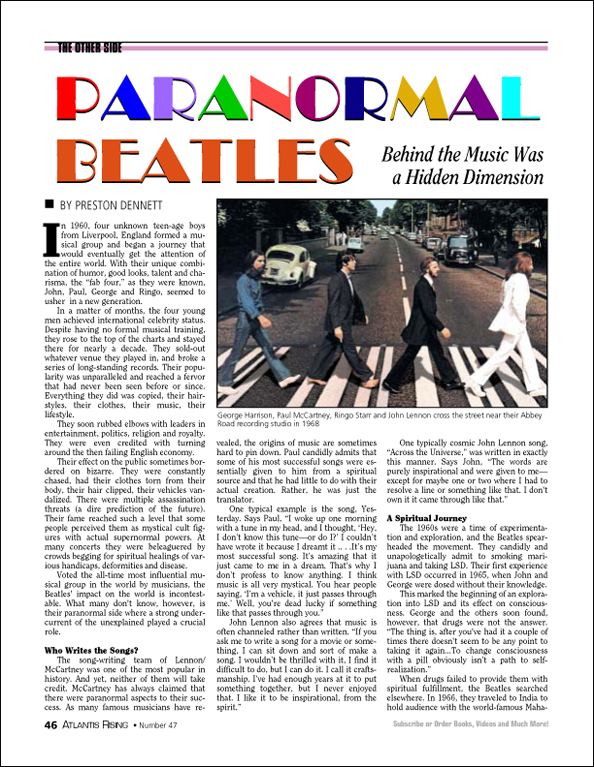 Posted on March 4, 2020September 29, 2020 by AReditorialDept Paranormal Beatles In 1960, four unknown teenage boys from Liverpool, England formed a musical group and began a journey that would eventually… You must be logged in to view this content. Post navigationPrevious post: Book Excerpt: Mythology as HistoryNext post: Once in a Blue Moon
