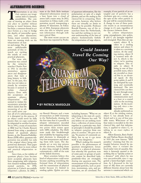 Posted on March 4, 2020October 2, 2020 by AReditorialDept Quantum Teleportation Teleportation is an idea that captures our imagination with its fantastic possibilities. The concept of moving an object from one… You must be logged in to view this content. Post navigationPrevious post: Moons Over MarsNext post: Meeting Monarchs