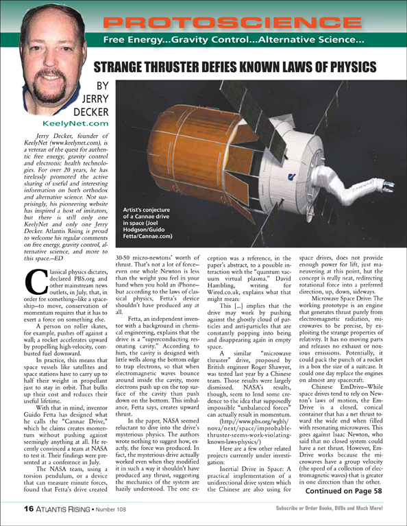 Posted on March 4, 2020March 31, 2020 by AReditorialDept Strange Thruster Defies Known Laws of Physics Jerry Decker, founder of KeelyNet (KeelyNet.com), is a veteran of the quest for authentic free energy, gravity control and electronic… You must be logged in to view this content. Post navigationPrevious post: Mythical MessagesNext post: Calico, California and the Early Man Dispute