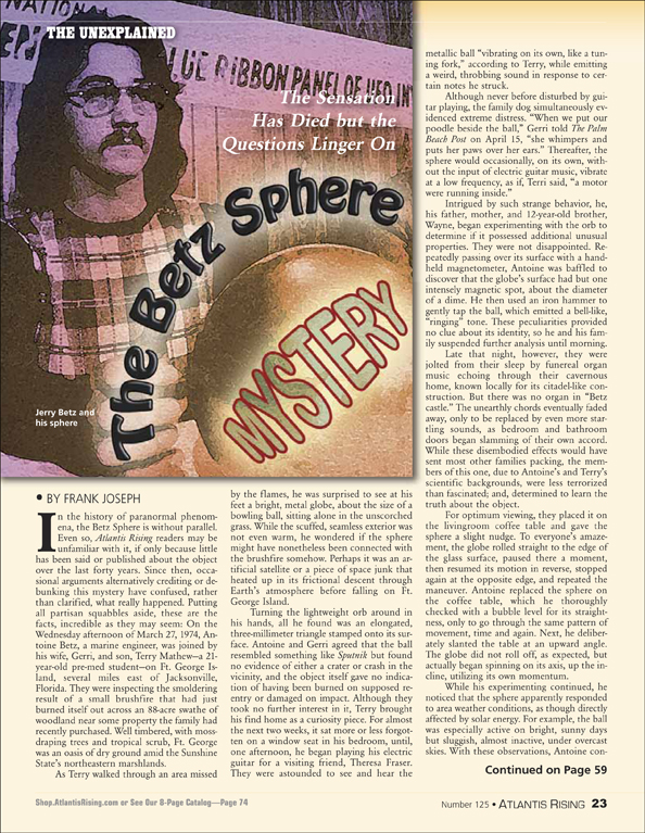 Posted on March 4, 2020November 24, 2020 by AReditorialDept The Betz Sphere Mystery In the history of paranormal phenomena, the Betz Sphere is without parallel. Even so, Atlantis Rising readers may be unfamiliar… You must be logged in to view this content. Post navigationPrevious post: Cuba’s Sunken City RevisitedNext post: Menorah: The Akhenaten Connection