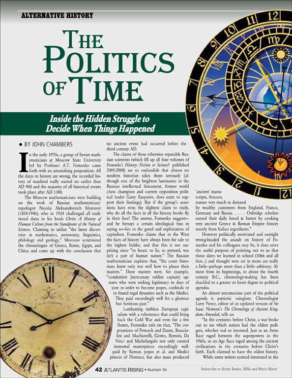 Posted on March 4, 2020October 2, 2020 by AReditorialDept The Politics of Time In the early 1970s, a group of Soviet mathematicians at Moscow State University led by Professor A.T. Fomenko came forth… You must be logged in to view this content. Post navigationPrevious post: Late Arrival?Next post: The Feng Shui Way