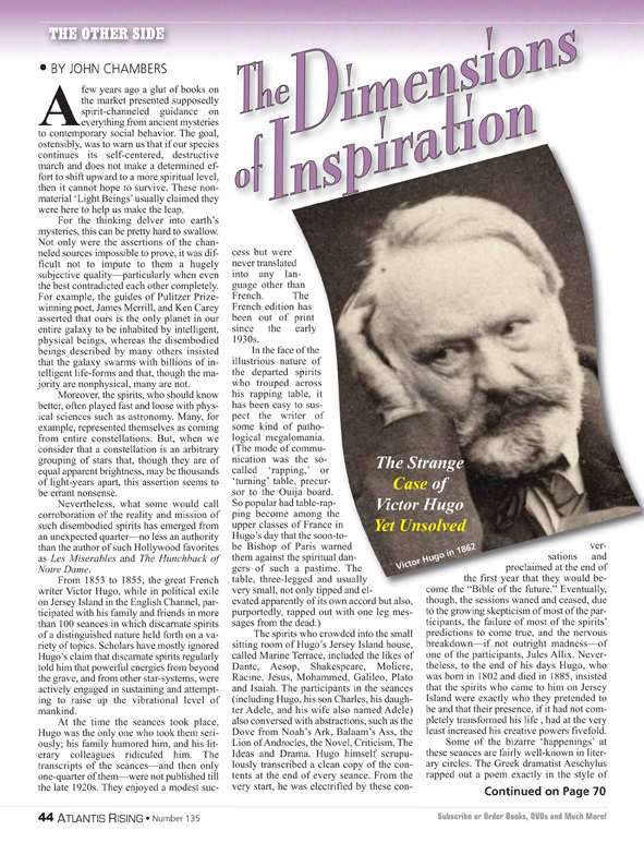 Posted on April 13, 2020September 29, 2020 by AReditorialDept The Dimensions of Inspiration The Strange Case of Victor Hugo Yet Unsolved By John Chambers A few years ago a glut of books on… You must be logged in to view this content. Post navigationPrevious post: Artificial Intelligence Identifies Unknown Human AncestorNext post: Church Energy
