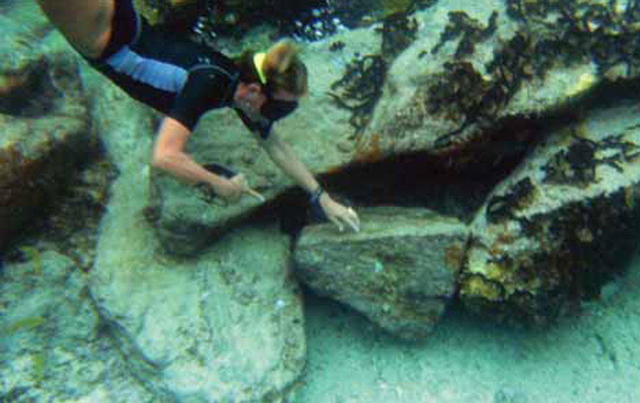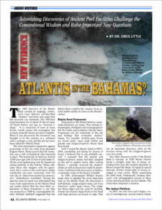 The new study appears to buttress findings by researchers Drs. Greg and Lora Little, and reported in Atlantis Rising Magazine #98 (March/April, 2013). Massive quarried stone ruins about 30 miles south of Bimini were reported at the time by the Littles. Dubbed “Brown’s Ruins” (named for Eslie and Krista Brown, the divers who found it) the site aroused considerable speculation in some quarters that it might be a relic of Atlantis. Atlantean or not, the anomalous features and the clearly artificial character of the site made it difficult to explain in standard academic terms.