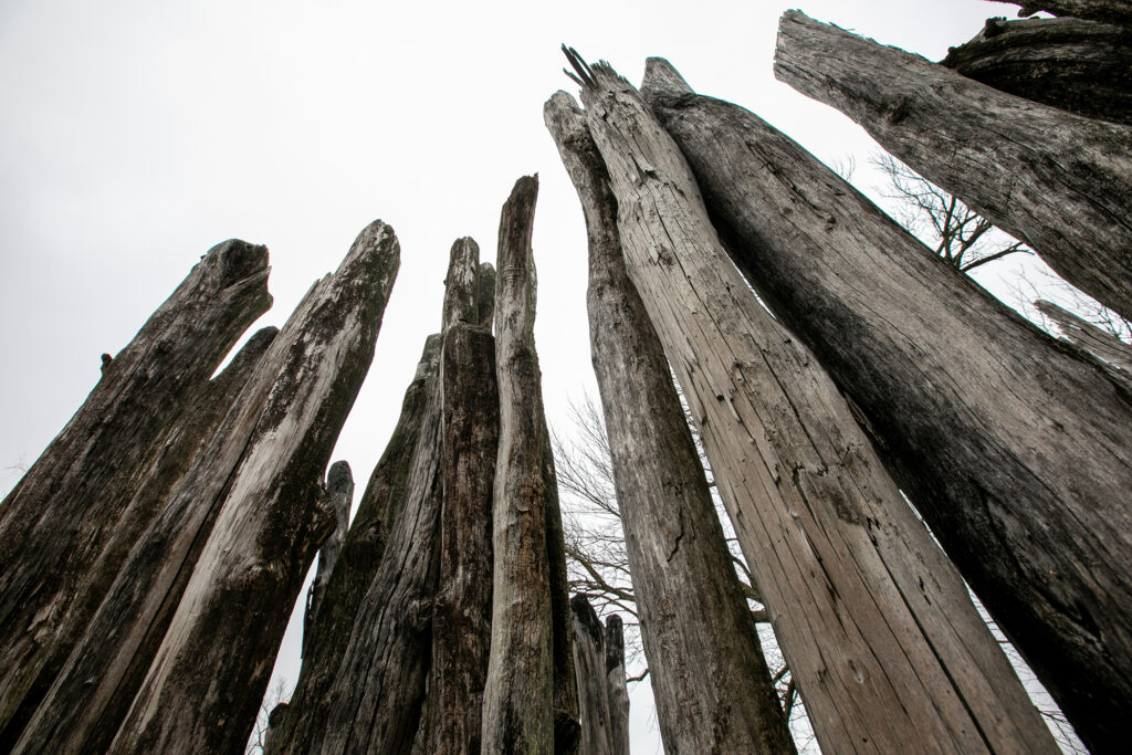 The stockade, or palisades, are log walls built for defense. Small portions of the stockades have been reconstructed at Cahokia Mounds State Historic Site. (Photo: Joe Angeles/Washington University)
