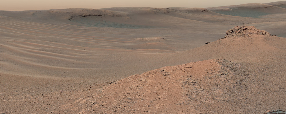 This Martian landscape includes the rocky landmark nicknamed “Knockfarril Hill” at center right and the edge of Vera Rubin Ridge, which runs along the top of the scene. The image was made from a mosaic captured by the Mast Camera aboard NASA’s Curiosity Mars rover as it explored the “clay-bearing unit” on Feb. 3, 2019, during the 2,309th Martian day, or sol, of Curiosity’s work on Mars.
