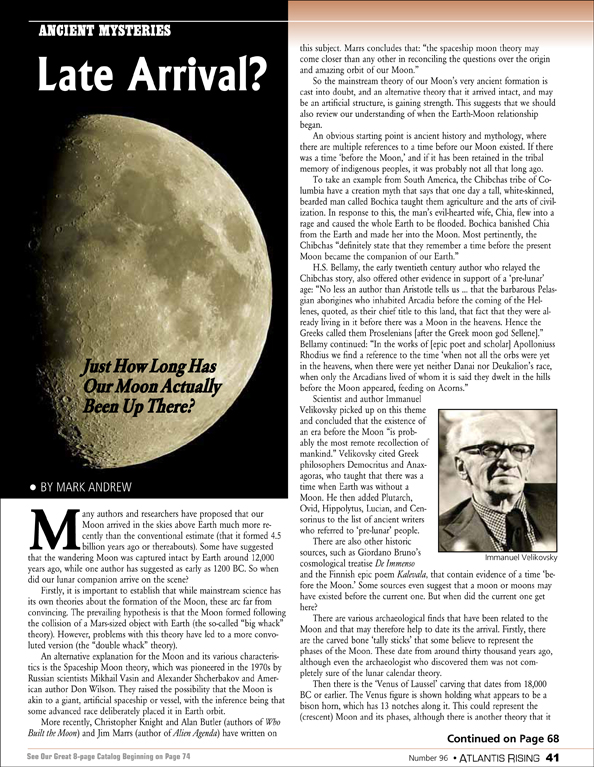 This dating was supported by French author Denis Saurat, whose own idea was that the crash landing of a previous moon ended an epoch of giants on Earth. H.S. Bellamy opted for a similar Moon capture period of eleven thousand five hundred to thirteen thousand years ago, as did modern author Henry Kroll, who suggests that Anunnaki aliens—of Zecharia Sitchin fame—were responsible for bringing the Moon to the Earth.