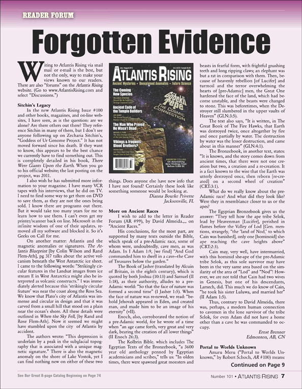 I wish to add to the letter in Reader Forum (AR #99), by David Almeida, on “Ancient Races.”